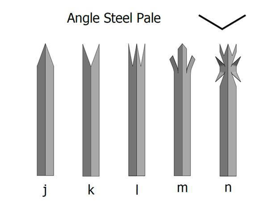 j. single pointed top; k. double pointed top; l. triple pointed top; m. triple pointed & splayed top; n. triple pointed & spikes top